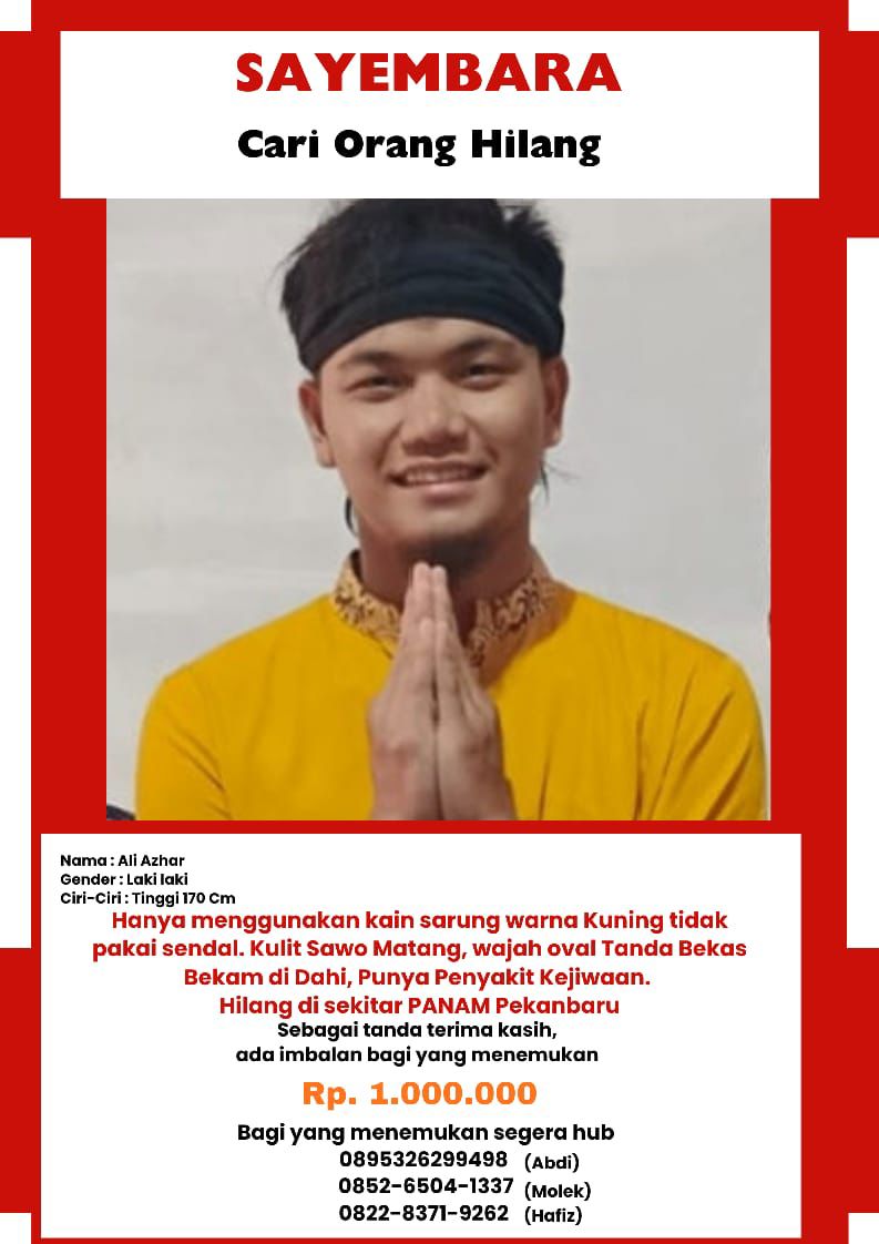 PEKANBARU,Riaueksis.com-Sudah 23 hari Ali Azhar tak pulang. Sejak Rabu sore, 24 September 2025, anak muda berusia dua puluhan tahun itu meninggalkan rumah di kawasan Panam, Pekanbaru, tanpa membawa apa-apa kecuali sarung kuning yang melilit tubuhnya. Tak ada sandal, tak ada ponsel, tak ada pesan perpisahan.